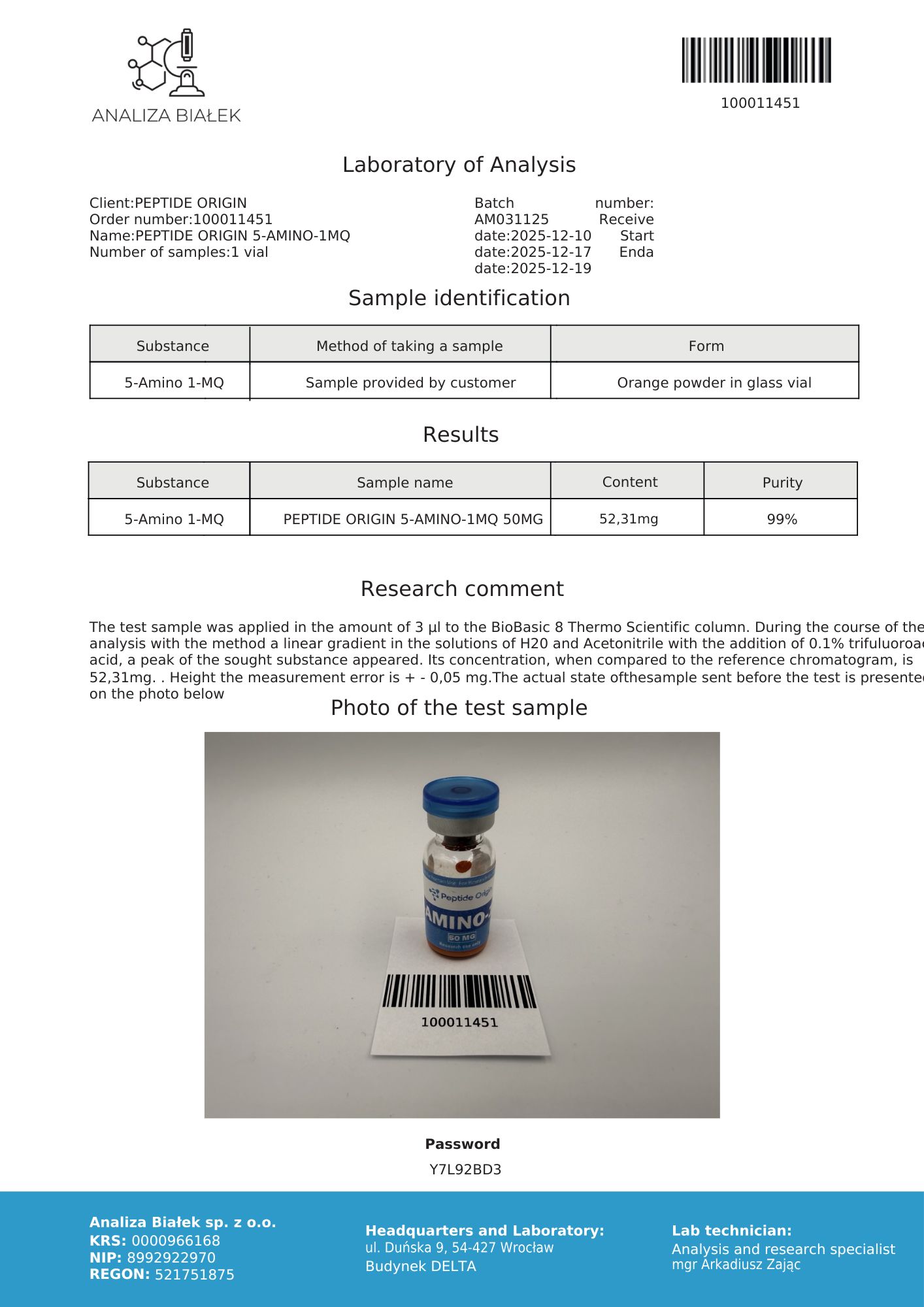 Certificate of Analysis (COA) available – please see below the latest batch documentation.