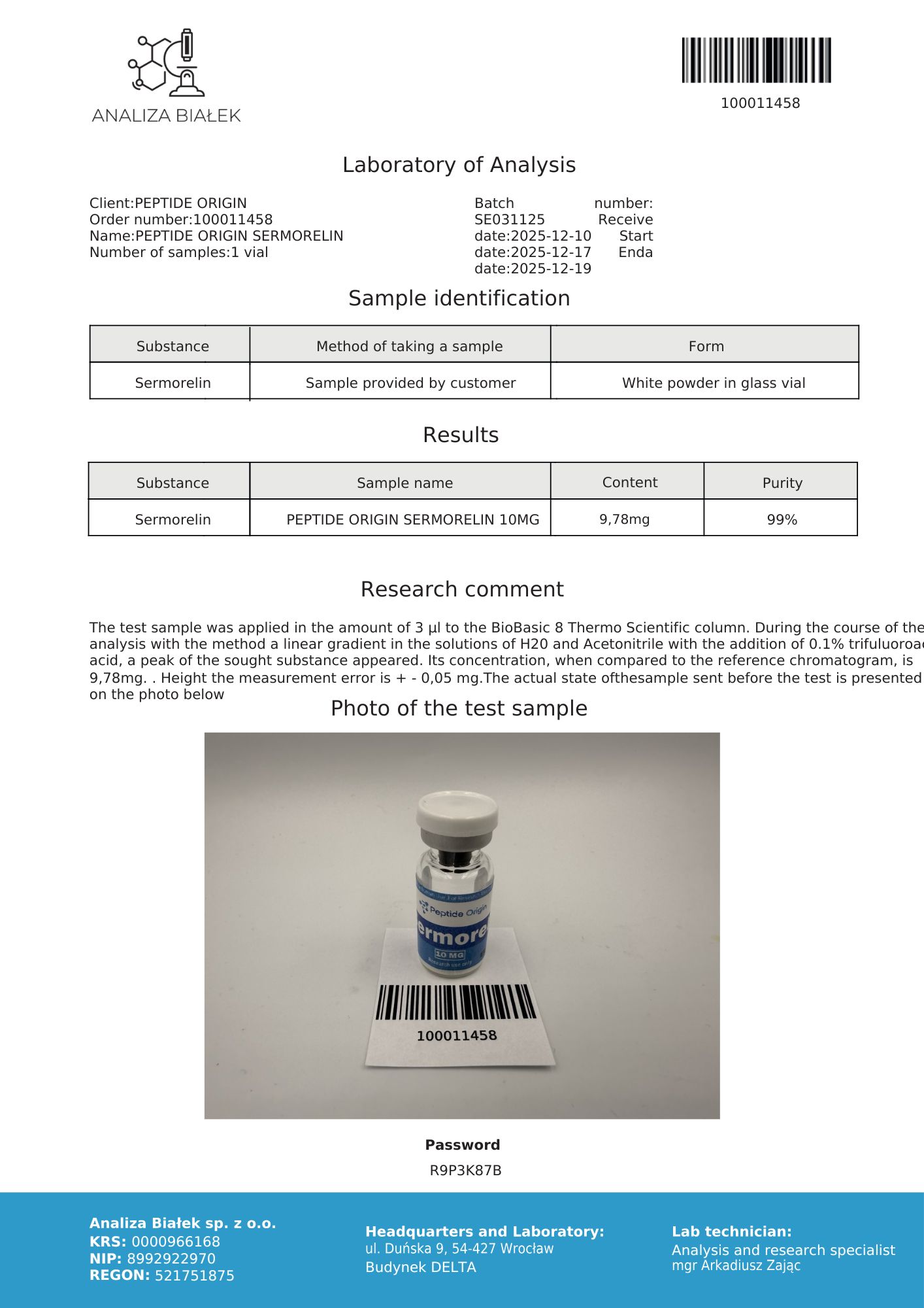 Certificate of Analysis (COA) available – please see below for the latest batch documentation.