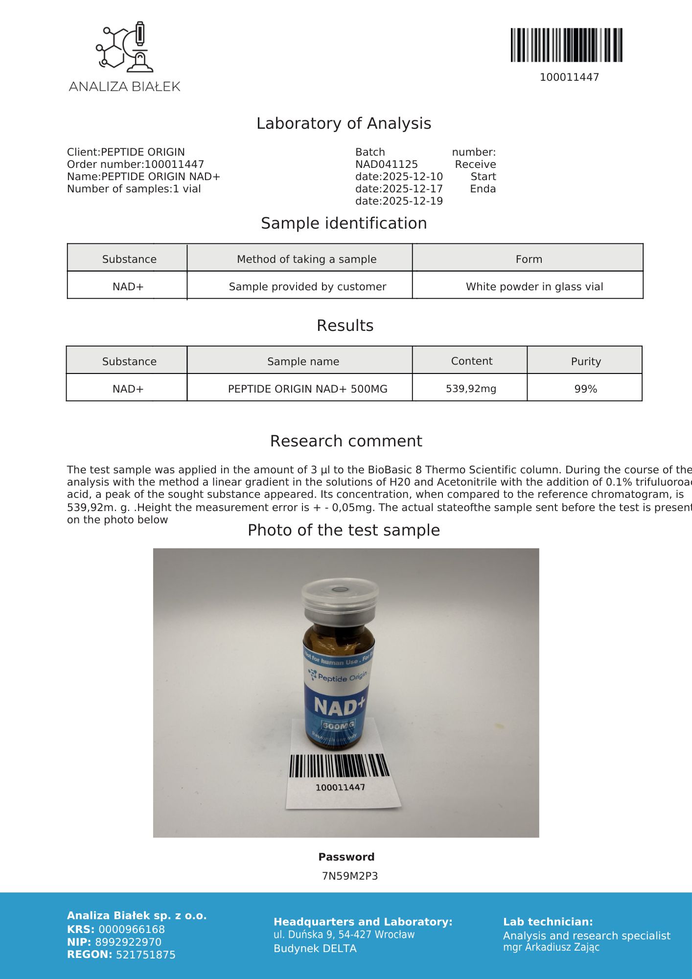 NAD+ is a naturally occurring coenzyme involved in cellular redox reactions. This product is a high-purity synthetic form supplied as a lyophilised powder for reconstitution in laboratory settings.