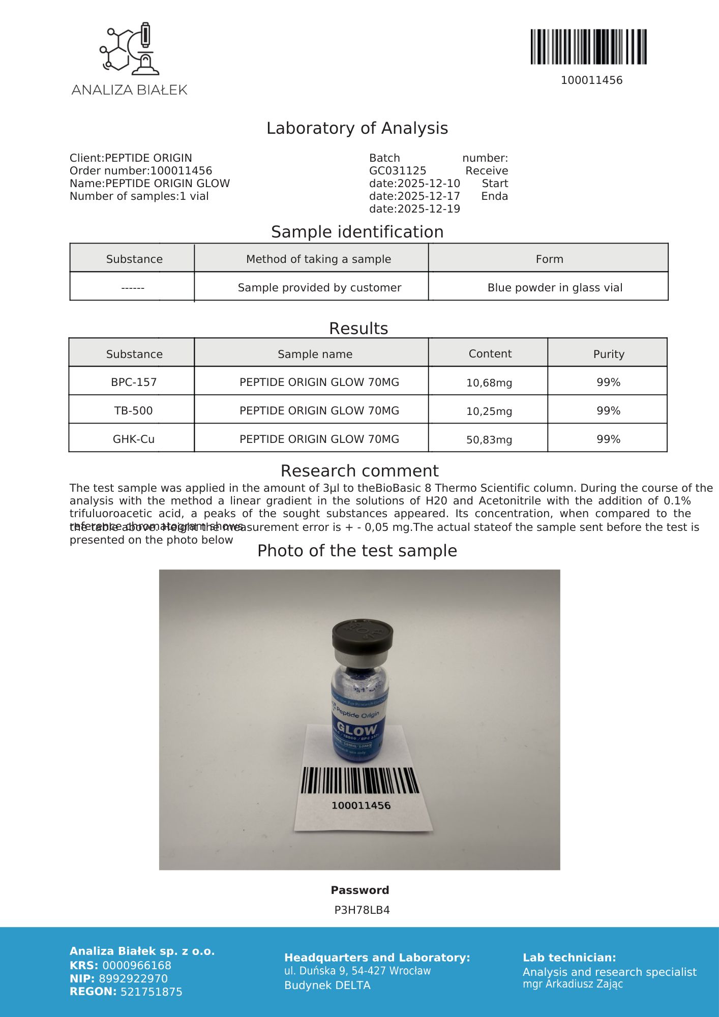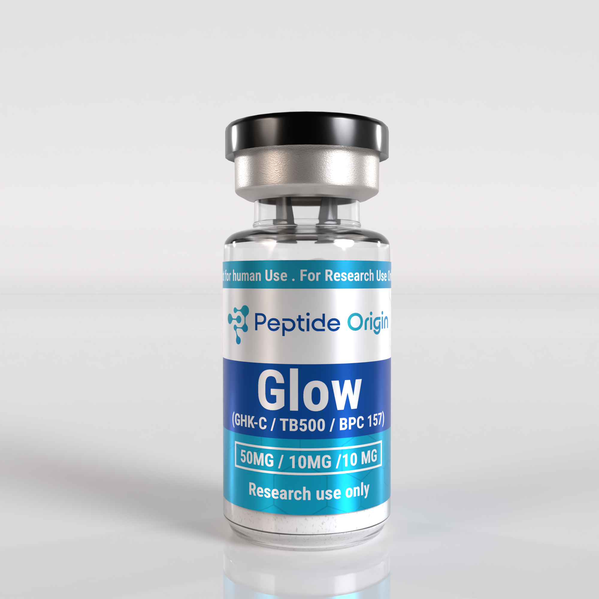 Glow 70 is a lyophilised blend containing 50mg of CHK-Cu (copper-bound peptide complex), 10mg of TB-500 (Thymosin Beta-4 active fragment), and 10mg of BPC-157 (Body Protection Compound-157), supplied as a powder for reconstitution in laboratory settings.