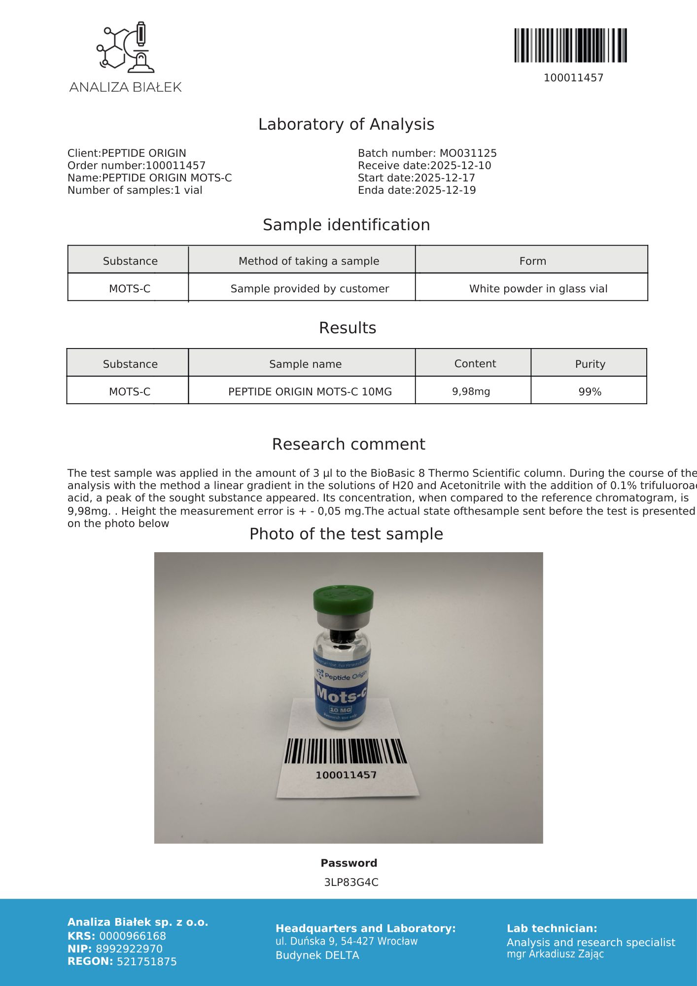 MOTS-c is a synthetic 16-amino-acid peptide encoded by the mitochondrial genome. It is supplied as a lyophilised powder for reconstitution in laboratory settings.